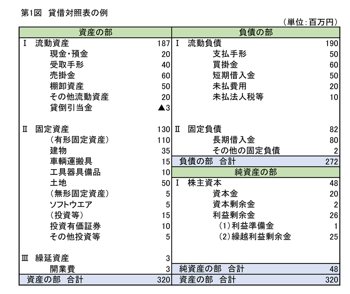 上から順に、「流動負債」「固定負債」が表示されています。貸借対照表は、左側と右側の合計金額が一致するルールとなっており、「資産の部」の合計と、「負債の部」および「純資産の部」の和である「総資本」が同額とならなければなりません。